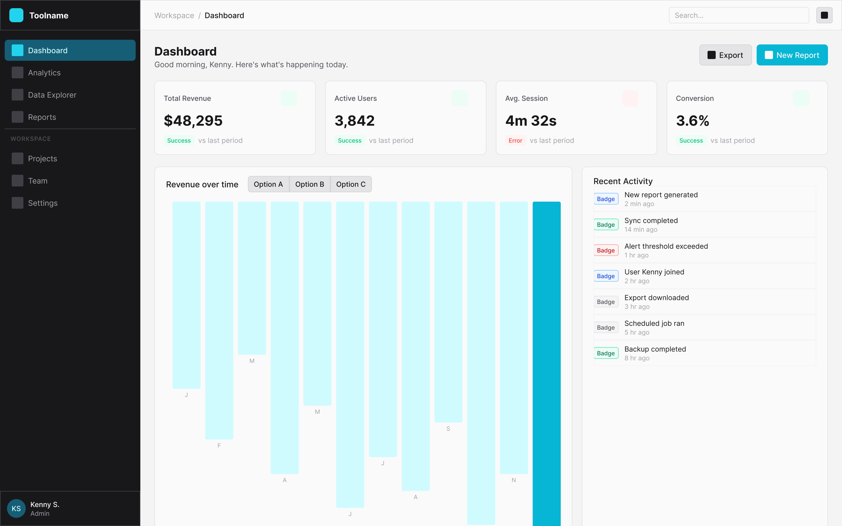 We then put together a basic component library containing core elements like buttons, input fields, badges, checkboxes, and tabs - enough to get a simple UI drafted. I explained to Claude that we would be designing a high performance, data heavy desktop application with a focus on high density analytics. I wanted to keep the brief relatively open for now, just to get the data visualisation elements such as progress bars, charts, and grids ready.