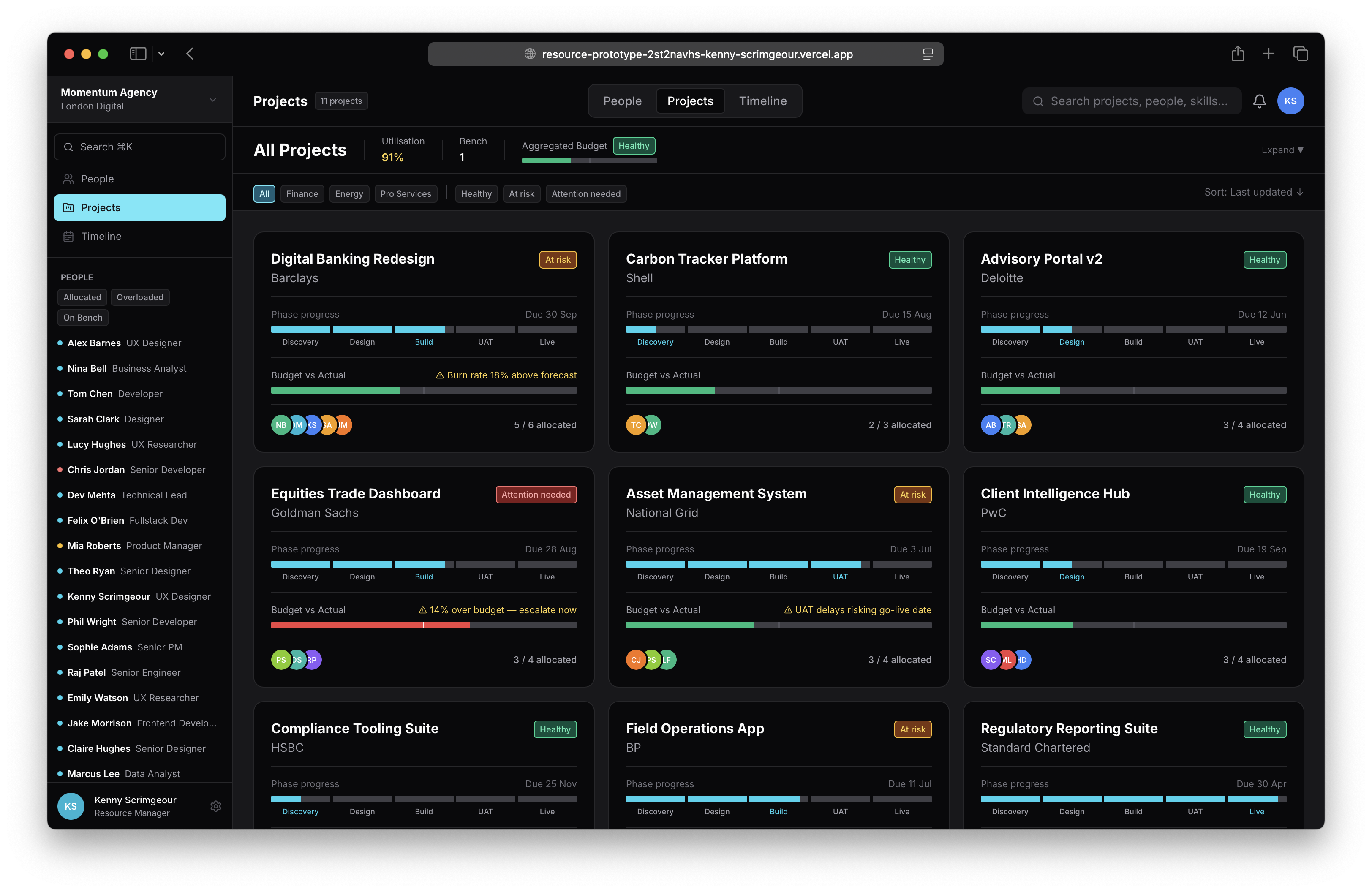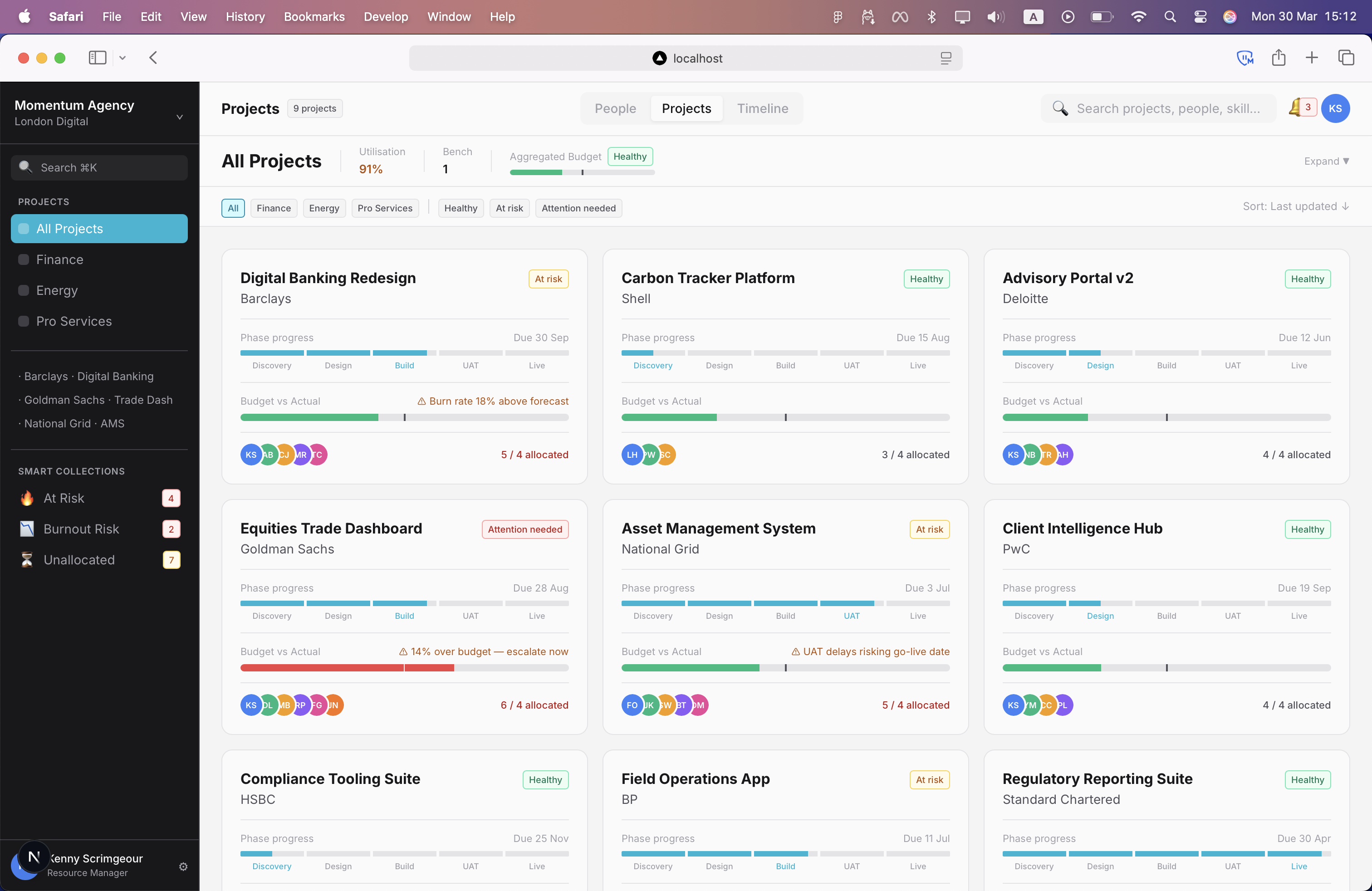 For added context: our imaginary agency specialises in developing products in the finance, energy and professional service sectors. In this scenario, most projects are going as planned, but a few are at risk of missing a deadline and one project is well over budget.