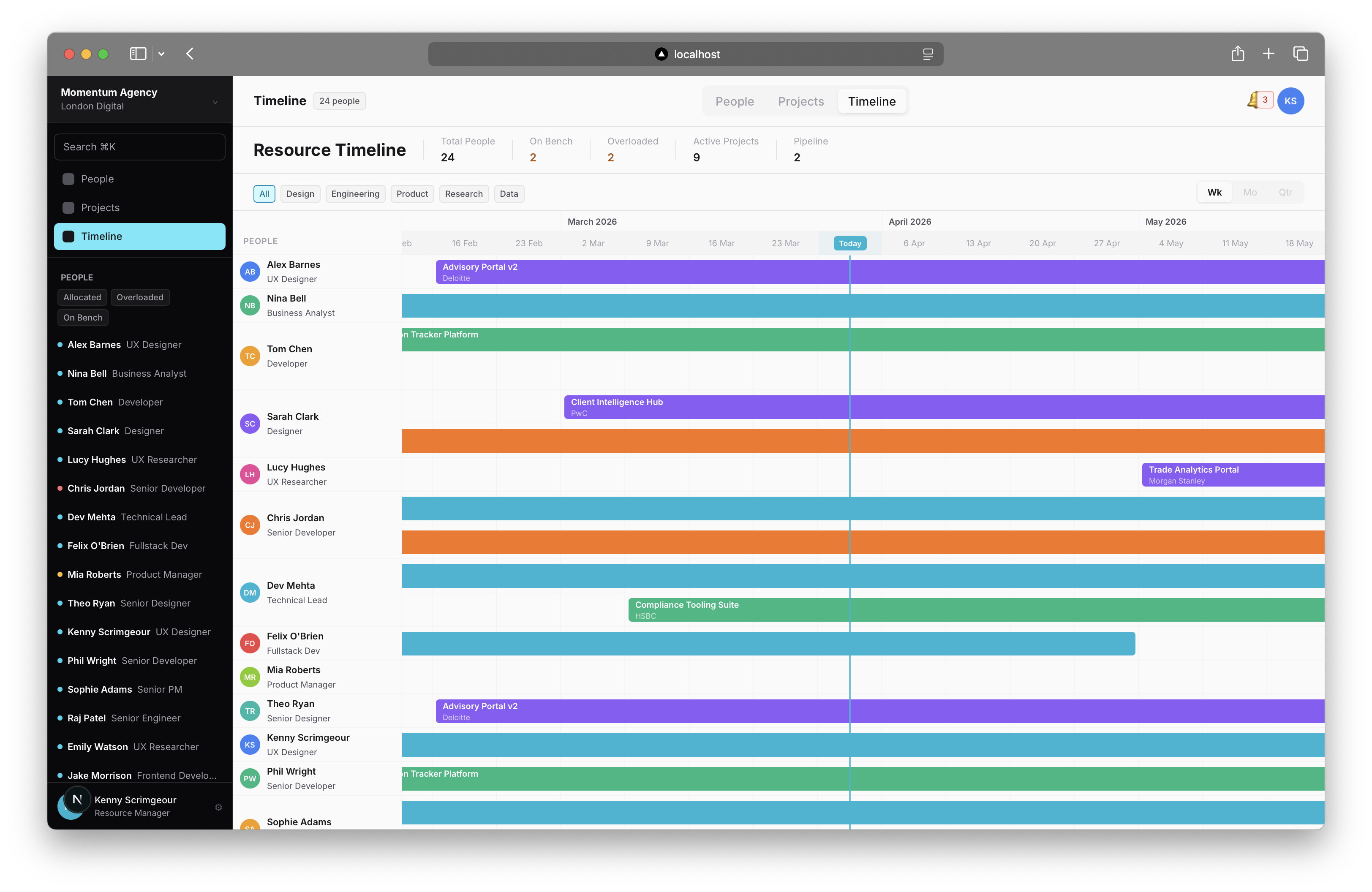 Since this would be my first time exploring the 'code to Figma' pipeline, I was on a mission to understand both the benefits and limitations of this workflow. And we aren’t exactly reinventing the wheel with a resource management tool here, but the goal was to go in blind, meaning no sourcing further inspiration from existing tools. We'll just be focusing on three screens: People Management, Project Management, and a Timeline.