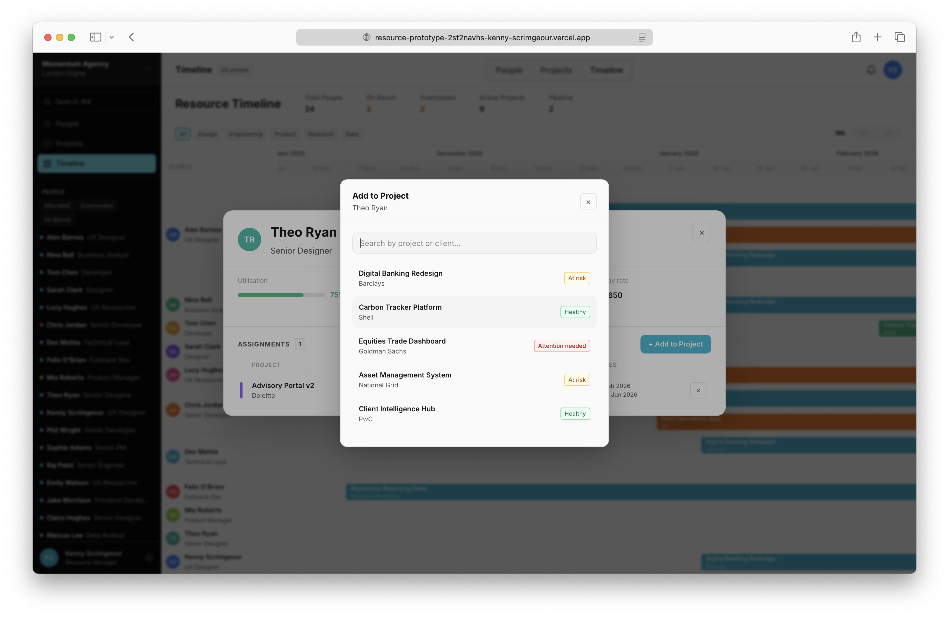 We also need a further pop-up that shows either a list of projects or people when adding a resource or assigning someone to a project.